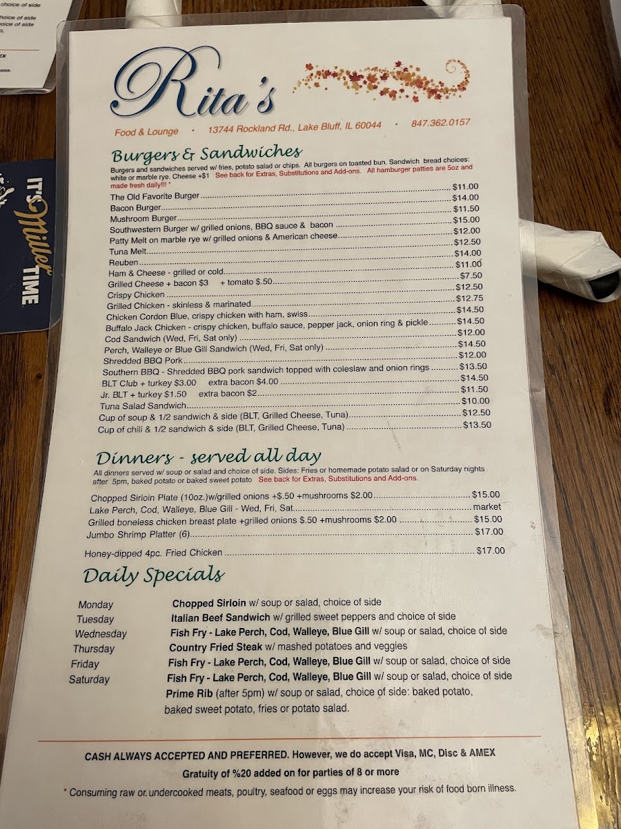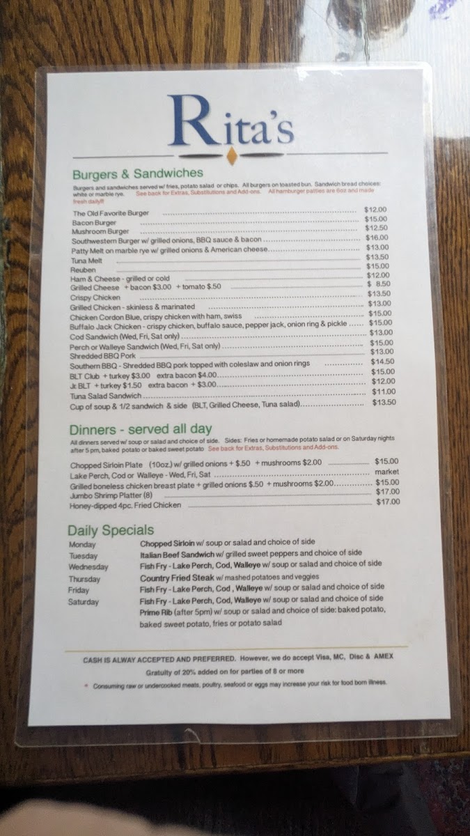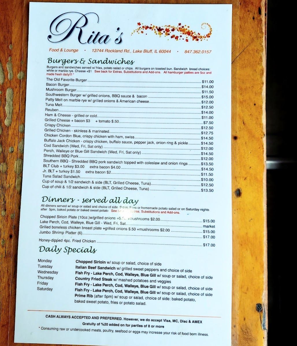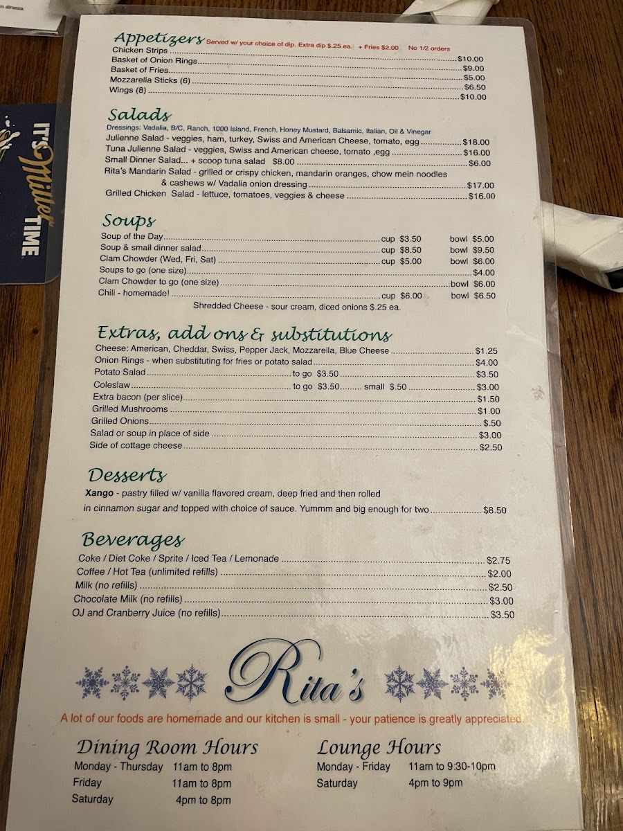 Rita’s also offers daily specials to enhance your dining experience. On Mondays, you can enjoy a Chopped Sirloin W/ Soup or Salad and Choice of Side, perfect for a comforting meal. Tuesdays feature an Italian Beef Sandwich W/ Grilled Sweet Peppers and Choice of Side, while Fridays bring in the classic Fish Fry and indulgent Prime Rib.